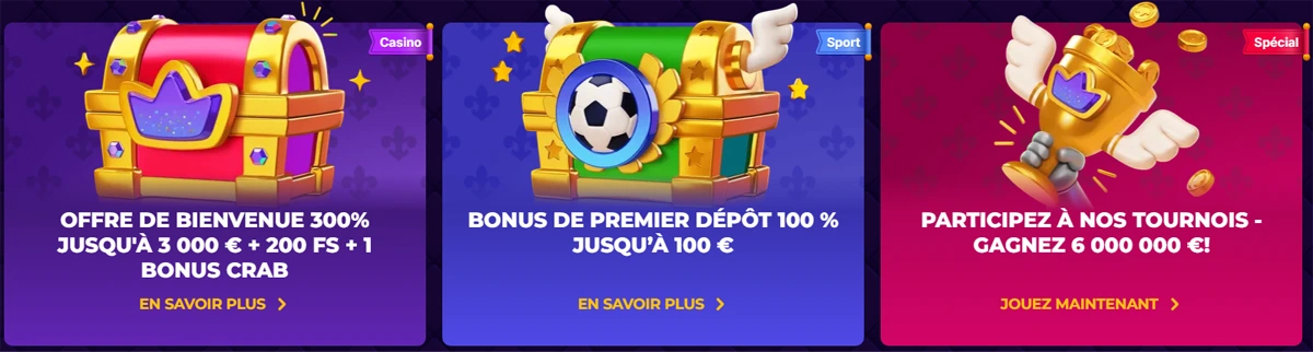 Bonus de bienvenue : 100% jusqu'à 750$ + 200 tours gratuits + Bonus CrabCashback : 10% sur le casino en direct jusqu'à 300$Conditions : Mise x35 pour les bonus, x40 pour les tours gratuits
