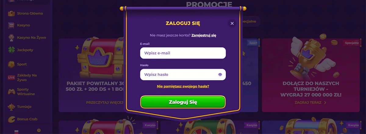 Przechodzimy na główną stronę Royal Game Casino i lokalizujemy przycisk "Zaloguj się" w prawym górnym rogu. Po kliknięciu otwiera się formularz logowania.